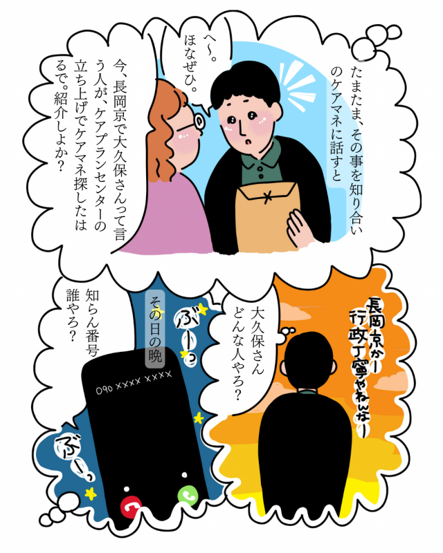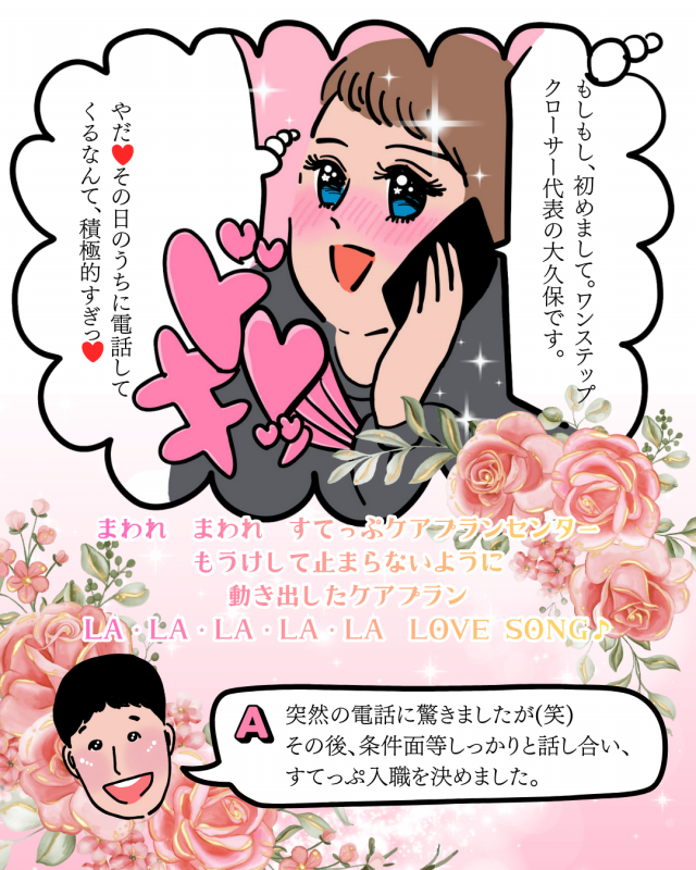 たまたまその事を知り合いのケアマネに話すと「今、長岡京で大久保さんって言う人が、ケアプランセンターの立ち上げでケアマネ探したはるで。」と紹介をされました。紹介を受けた当日の夜に、突然大久保代表から私にお電話があり、突然の電話に驚きましたが(笑)その後、条件面等しっかりと話し合い、すてっぷ入職を決めました😆