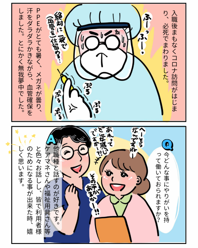 入職後まもなくコロナ訪問がはじまり、必死でまわりました。PPEがとても暑く、メガネが曇り、汗をダラダラかきながら、血管確保をしました。とにかく無我夢中でした。