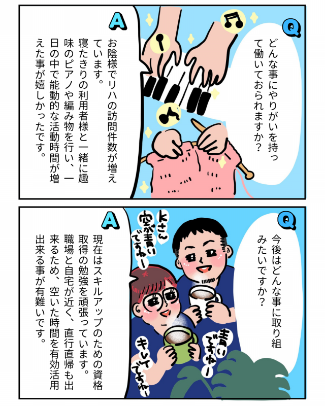 寝たきりの利用者様と一緒に趣味のピアノや編み物を行い、一日の中で能動的な活動時間が増えた事が嬉しかったです。